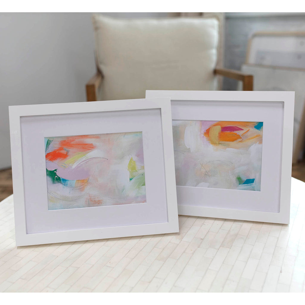 This print pair is reproduced on archival matte fine art paper, matted and framed in white. Each framed work measures 9 x 11 inches. Ready to hang.