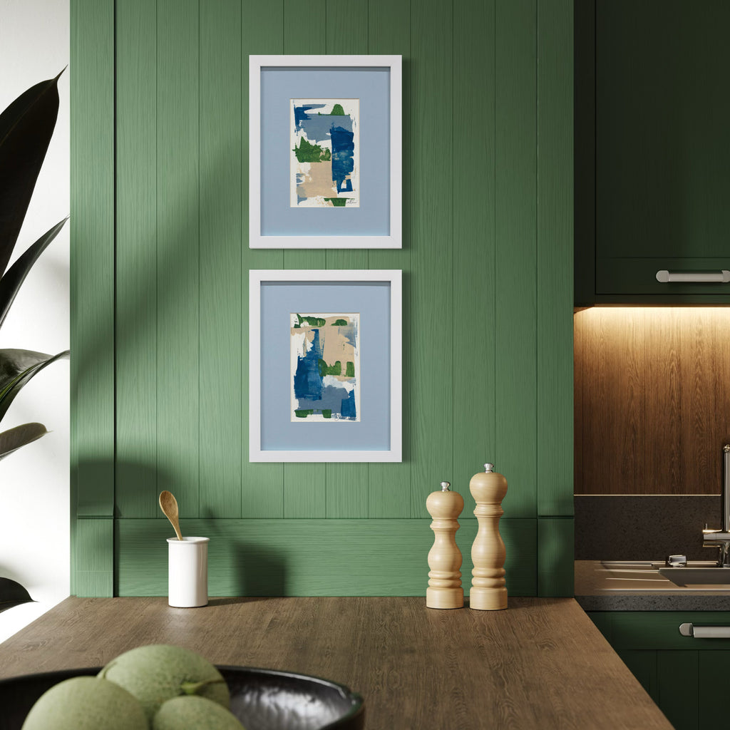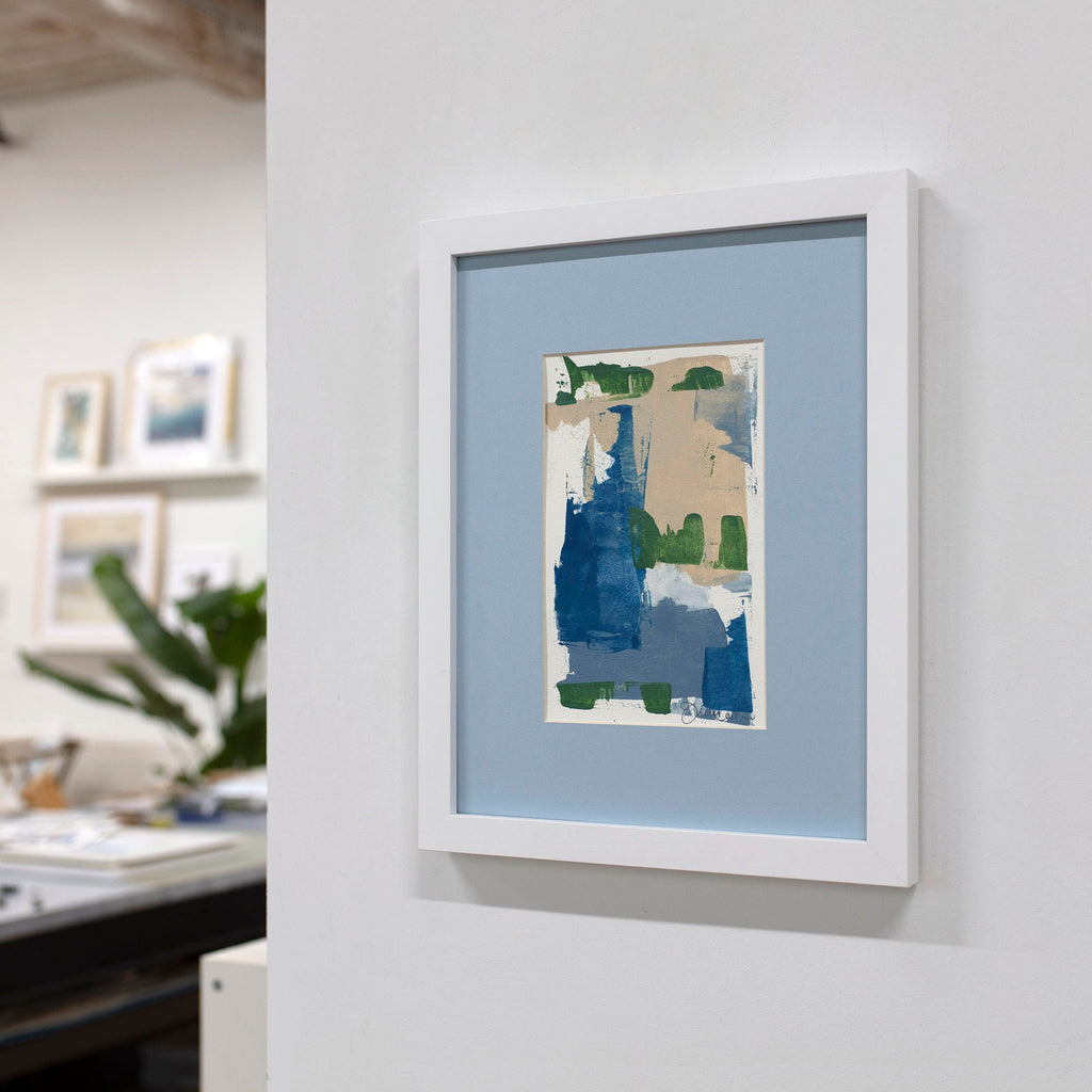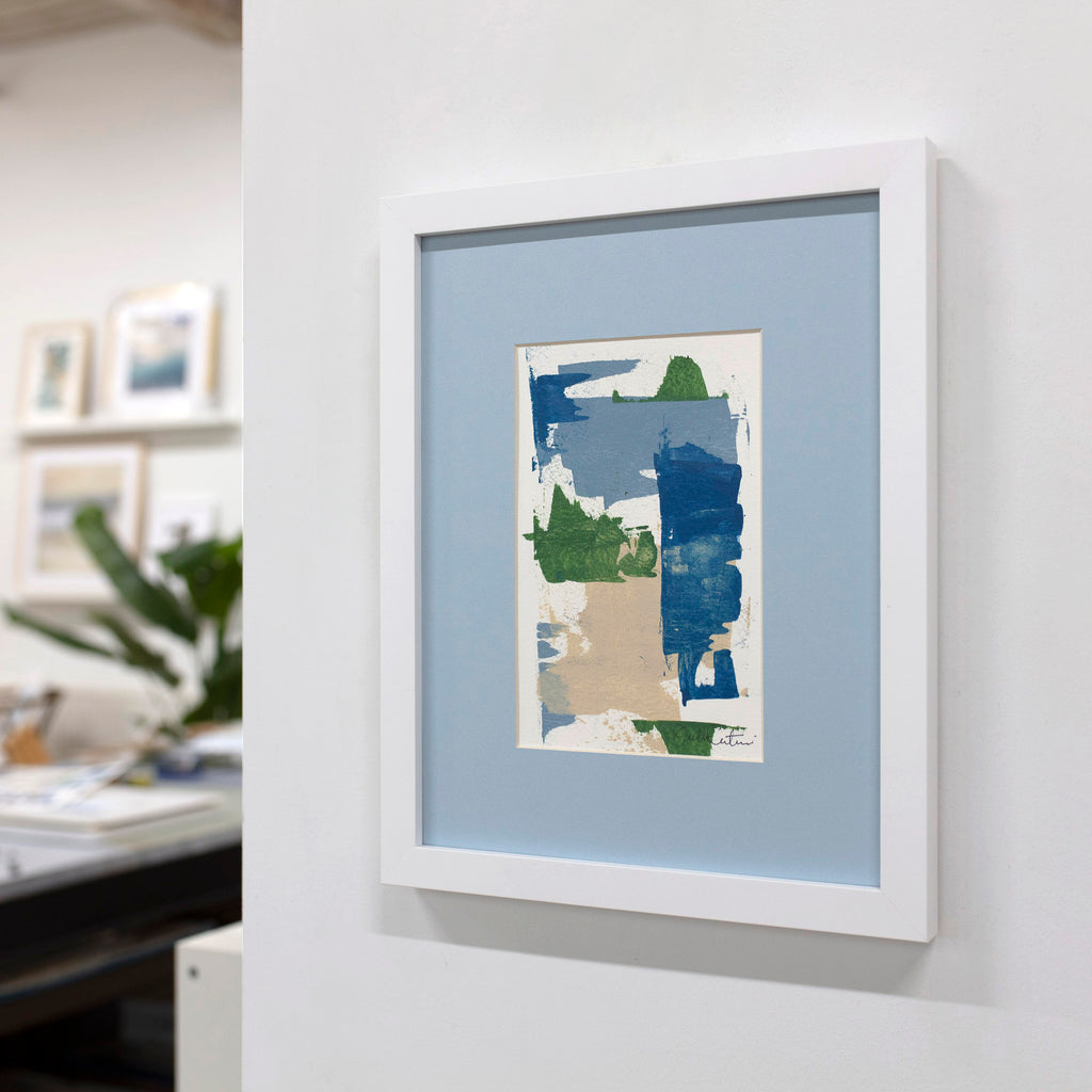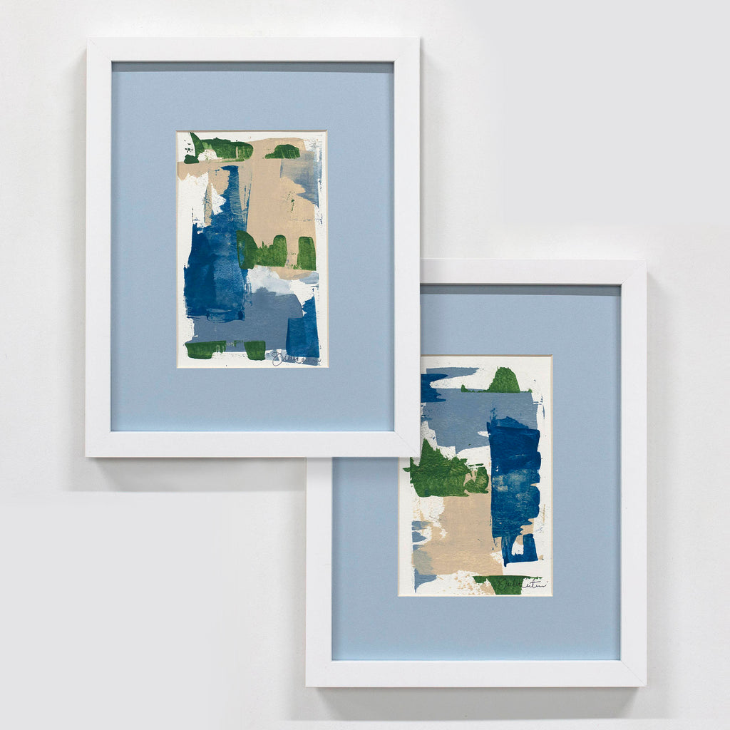 Each original painting on paper is matted in soft blue and finished in a custom white frame. Paintings are accompanied with an artist signed certificate of authenticity and signed on the lower right corner. Ready to hang.