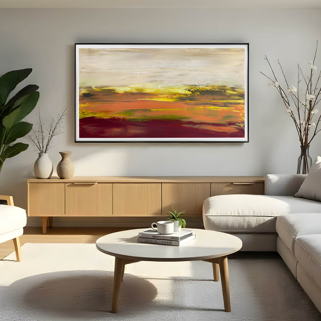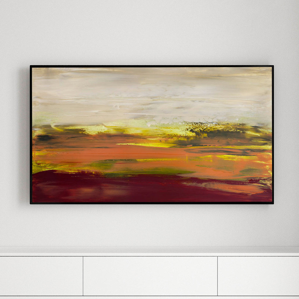Soft yet striking, Calypso Glow radiates a quiet warmth — like golden hour light sweeping across tropical terrain. Earthy reds and sunlit greens dance beneath a veil of misted neutrals, creating a layered sense of stillness and motion.