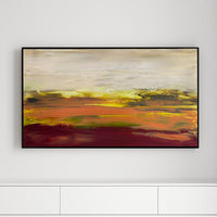 Soft yet striking, Calypso Glow radiates a quiet warmth — like golden hour light sweeping across tropical terrain. Earthy reds and sunlit greens dance beneath a veil of misted neutrals, creating a layered sense of stillness and motion. This piece captures the essence of relaxed luxury, where rich color meets refined restraint. It invites the viewer into a dreamy, vintage-tinged paradise—one that shimmers with secrets just beneath the surface.