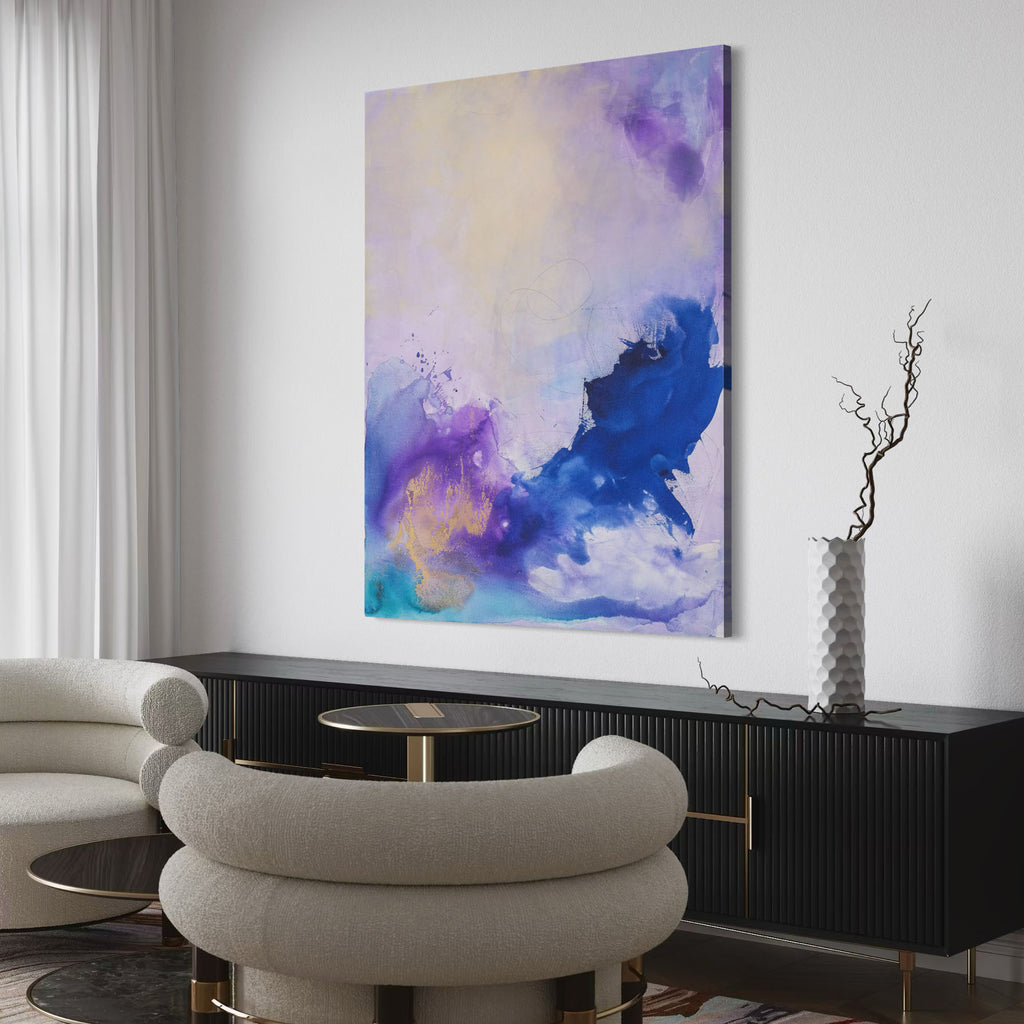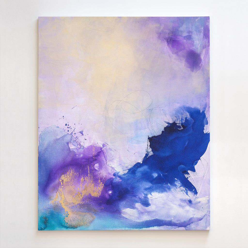 A stand-alone statement piece, Together We Rise explores uplift and suspension through layered movement, soft transitions, and moments of quiet luminosity. Fluid washes of blue and violet are balanced with lighter, open space and restrained gold accents, creating a sense of ascent that feels calm, expansive, and intentional.