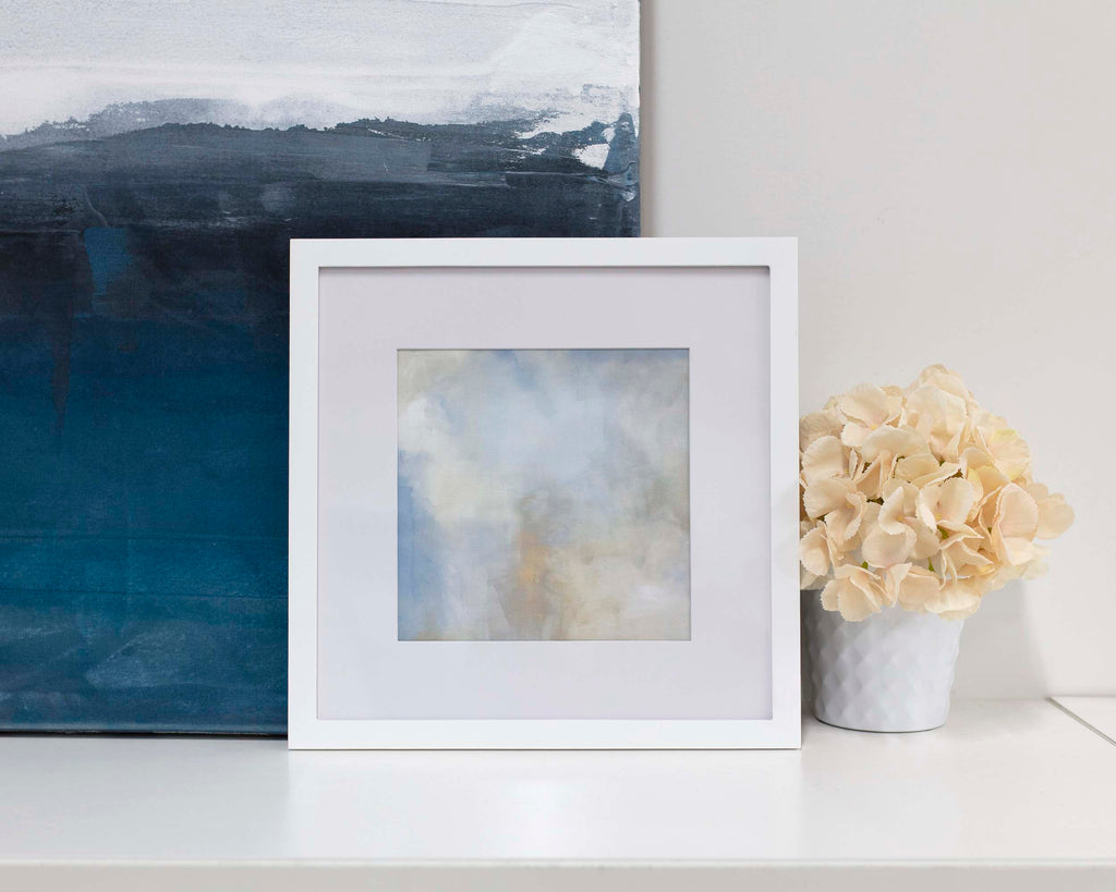 This subtle color palette is soft and atmospheric in feeling, delivering tranquil vibes to any environment. This canvas print is matted and finished in a standard white frame. Comes ready to hang.