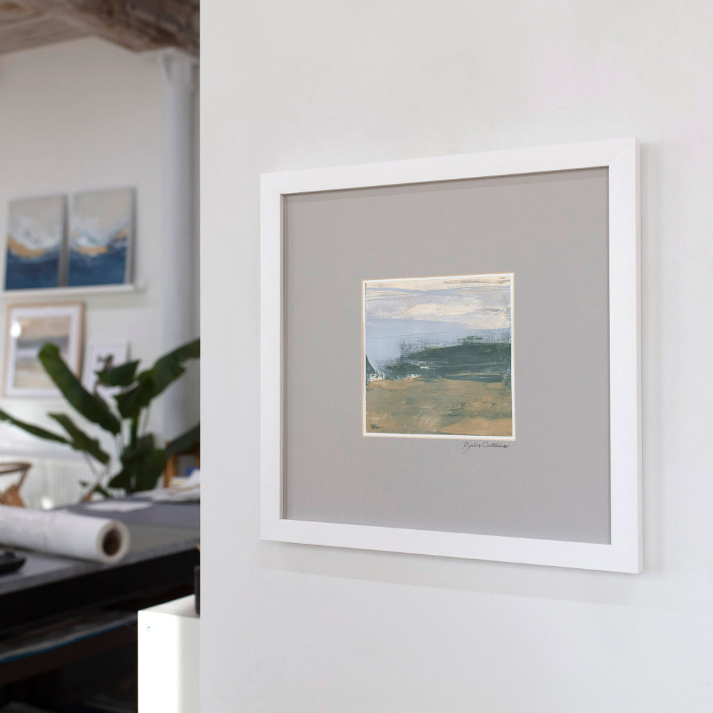 Finished in a white wood moulding with a gray colored mat, Open Field No. 7 and No. 8 is both modern and timeless, offering a contemplative focal point for any space. Signed on the lower right and the back. Ready to hang.